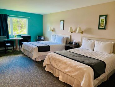 Two queen beds, smart television, full bath, refrigerator, microwave